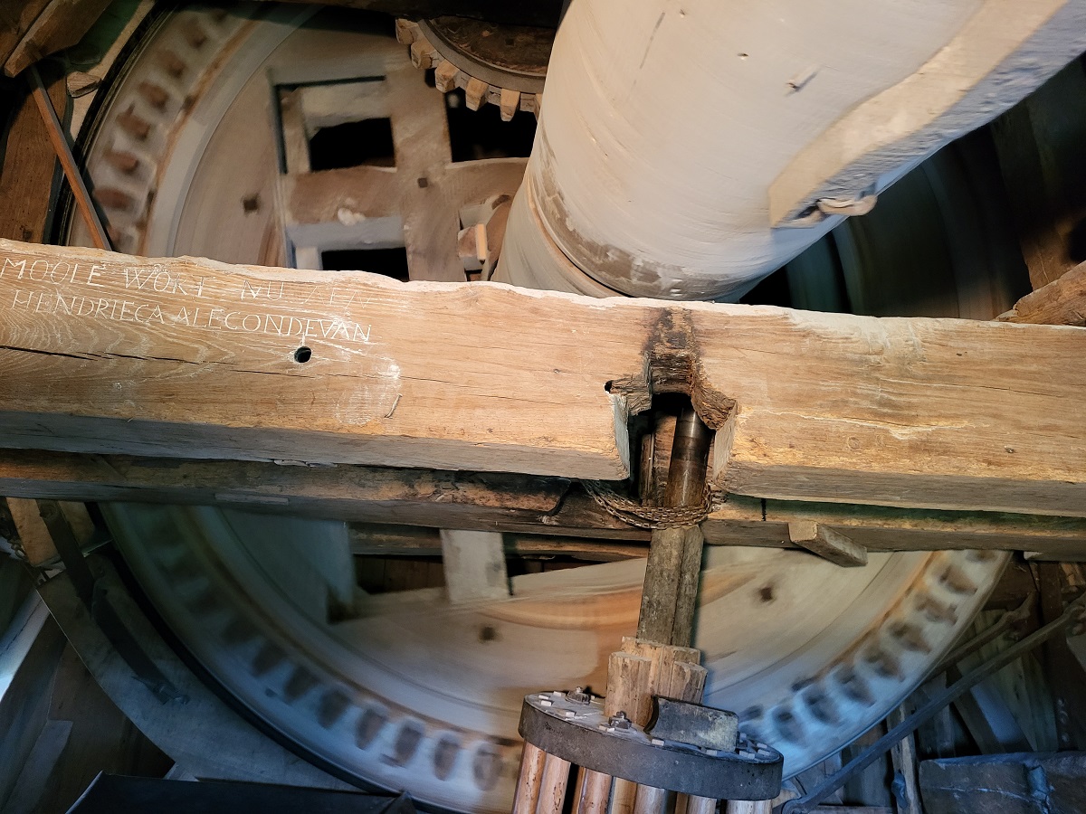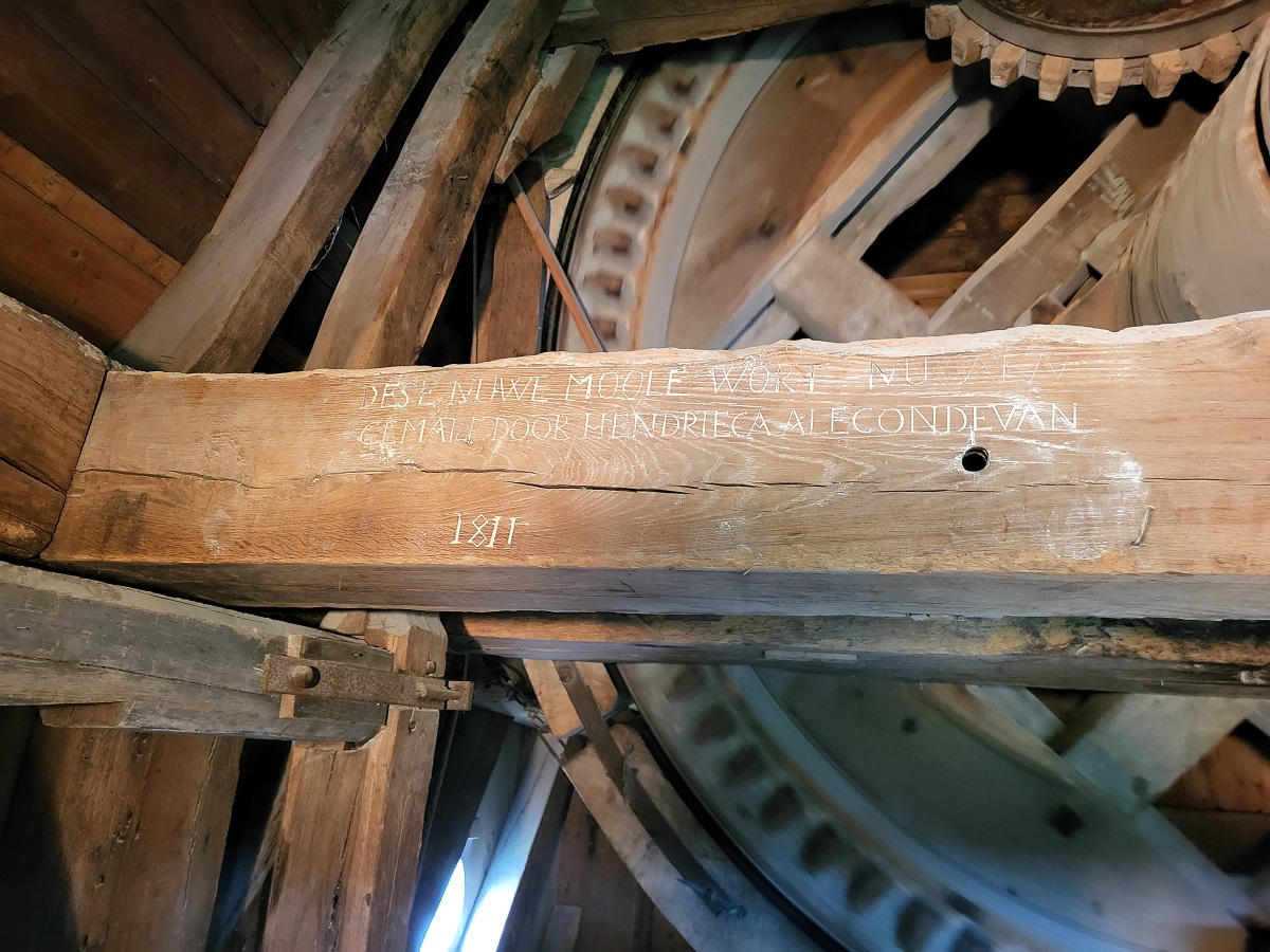 Binnenin de molen is op een van de houten balken een bijzondere, oude inscriptie te vinden. Deze inscriptie dateert uit het bouwjaar 1811 en vormt een tastbaar bewijs van de lange geschiedenis die de molen met zich meedraagt.